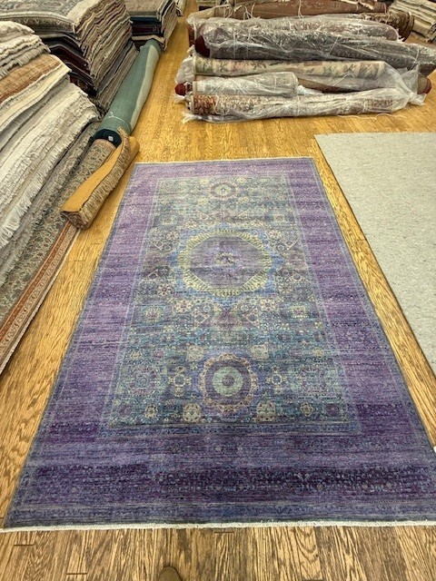 Humza Jafri sold this customer a 6x9 gorgeous Mamlouk rug. The Mamlouk dynasty was known for having distinctive medallions including geometric motif in their rugs. This rug was made in Pakistan and took about 6-8 mtonths to make by hand. The rug is made with a mix of lilac and magenta to achieve that purple richness. The rug is 100% hand knotted.