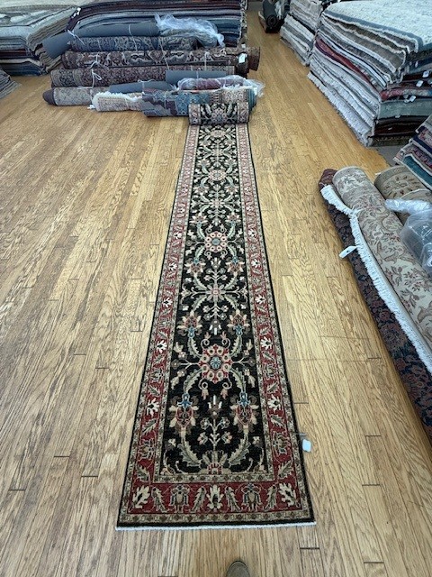 Humza Jafri sold this customer a classic Persian Sultanabad runner. The rug was made in Pakistan and has an interplay of charcoal, rust and teal and gold. The rug is a very rustic and has an abrash on the rug showring variances of lighter and darker colors giving the rug an antique aesthetic.