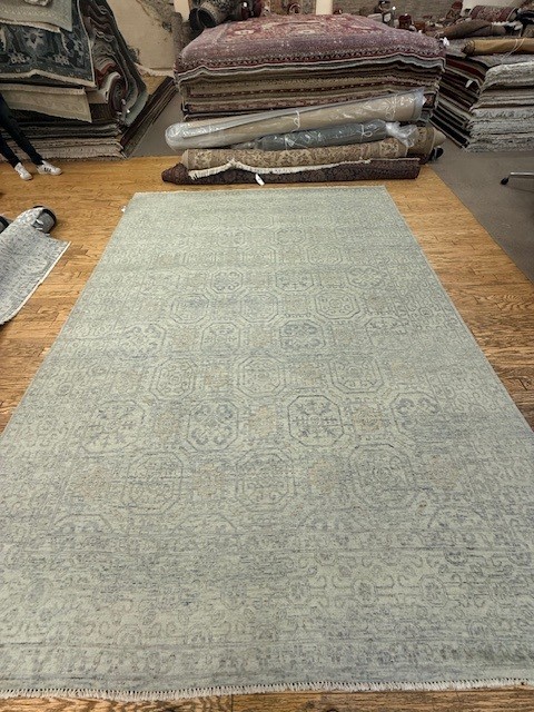 Humza Jafri sold this customer a very unusual rug. The rug is a Khotan design from the Xin Xiang province of China. The rug is known for its medallions and geometric motif. This rug was made in Pakistan and was made with sage, eucalyptus, apricot and denim vegetable dyes which reflects the overall soft colors and muted nature.