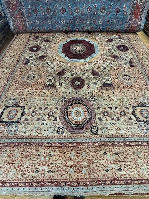 Humza Jafri sold this beautiful and rich 10x14 Mamlouk rug. This rug was made in Pakistan and took about a year and half to make by hand. The rug is a densely knotted rug. The rug has an interplay of color which is very layered including beige, jade, red, magenta, fuscia, navy, and terracotta