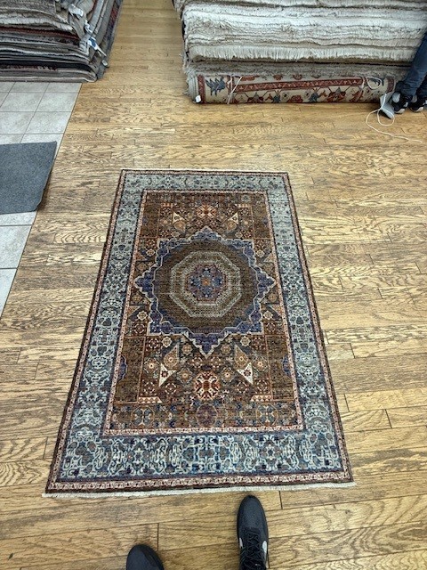Humza Jafri sold this customer a classic 4x6 Mamlouk rug. The rug has an ornate geometric motif and is densely knotted. The rug has a rich coloration including champagne, pomegranate, sand, navy, pomegranate, magenta, fuscia and soft blues around the borders. The rug is 100% hand knotted and was made with vegetable dyes.