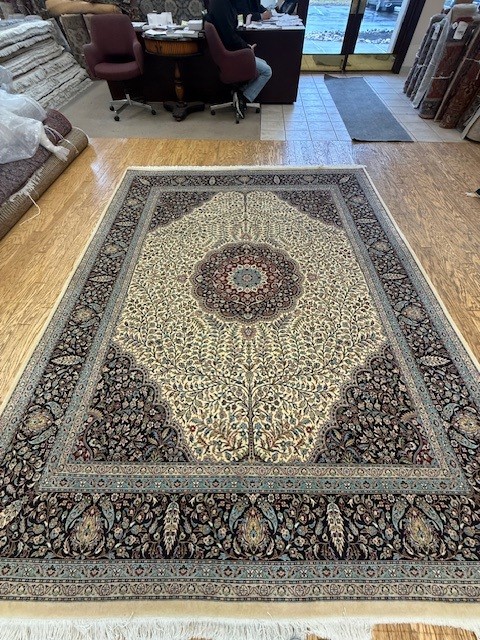 Humza Jafri sold this customer an 8x10 living room rug. The rug is a beautiful garden Tabriz rug with a central medallion. The rug was made in Pakistan and is 16/18 quality. The rug was made with vegetable dyes and is a classic tree of life motif throughout the border showing the cypress trees. This is an exclusive rug from the Humza Jafri Signature collection and shows the signature of Humza Jafri on the top center in urdu.